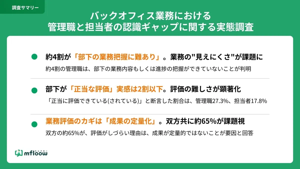 調査では、管理職の65.0%と担当者の64.6%が「成果が定量的に評価されにくい」と感じています。このように、上司と部下の双方が同様の課題を認識していることがわかりました。