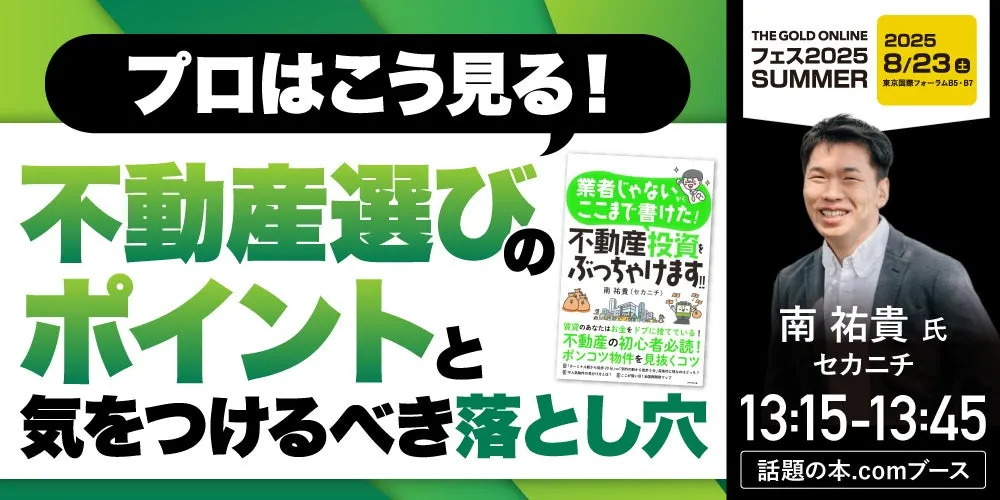 2025年8月23日(土)、東京国際フォーラムにて「THE GOLD ONLINE フェス 2025 SUMMER」が開催されます。イベントの一環として、人気経済作家でありSNSでも10万人以上のフォロワーを持つ南祐貴氏(通称セカニチ)が特別セミナーを行います。セミナーのタイトルは『プロはこう見る!不動産選びのポイントと、気をつけるべき落とし穴』です。