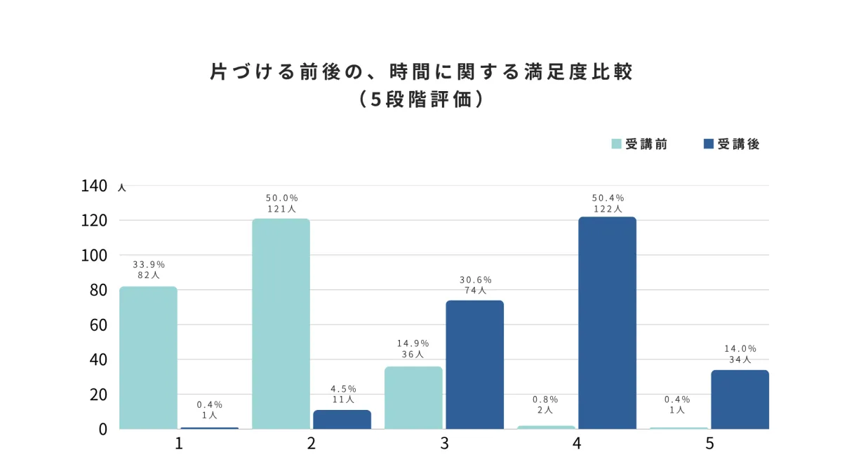調査によると、家庭力アッププロジェクト®に参加する前には「時間の使い方に満足している」と感じていた人は14.9%だったのに対し、受講後にはその数字が50.4%に上昇しました。これは、家庭環境を整えることによって、時間の使い方に対する満足感が大きく改善されたことを示しています。