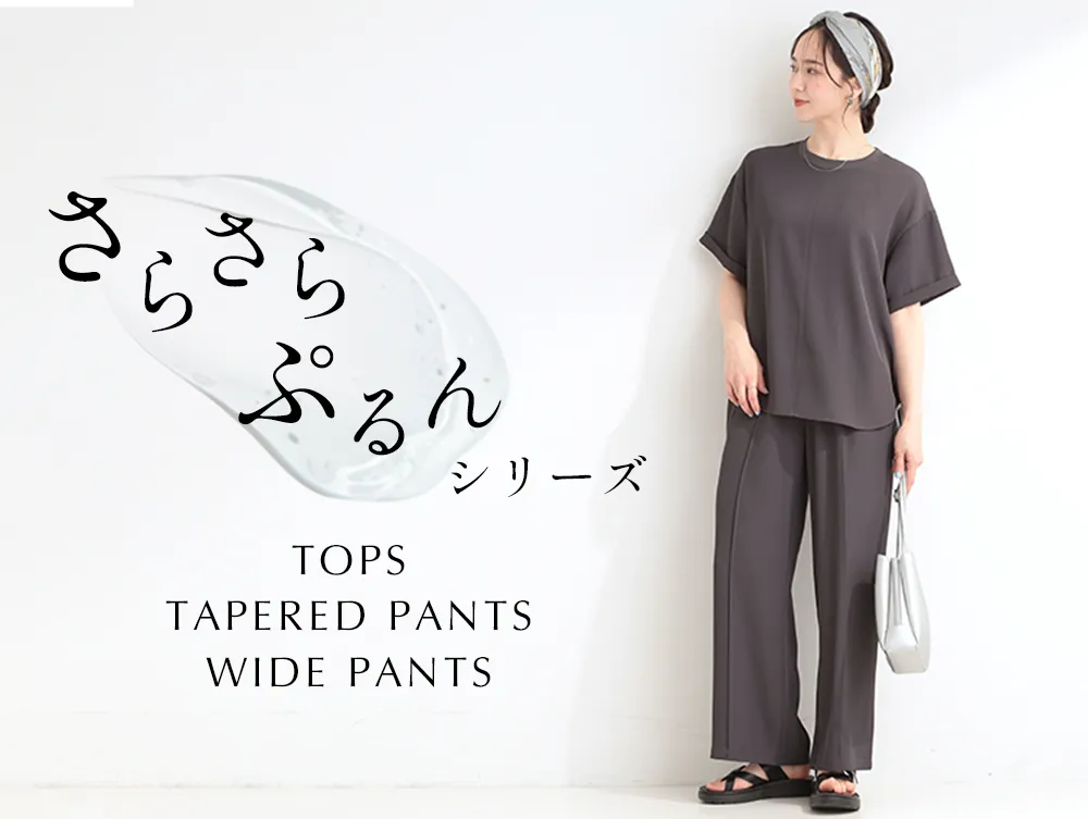 この夏の新作は、さらさらぷるんパンツに加え、ワイドパンツとセットアップ可能なトップスが登場しました。特にイージーワイドパンツは、センターに入ったピンタックデザインが美脚効果を助け、楽な着用感も特徴です。ゴム仕様のウエストだから、ストレスフリーで脱ぎ着も簡単です。カジュアルからビジネスシーンまで、さまざまなシーンに適応できるアイテムです。
