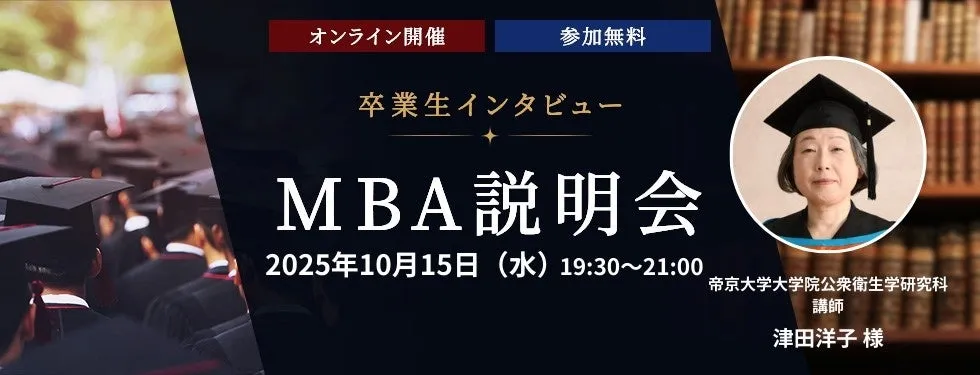 次回の説明会は、2025年10月15日(水)にオンラインで開催します。時間は19:30から21:00となっており、参加費は無料です。特別講師として、帝京大学大学院公衆衛生学研究科の津田洋子教授をお招きし、彼女がMBA取得を決意した背景や授業での学び、そして産業保健分野での実践経験についてお話しいただきます。