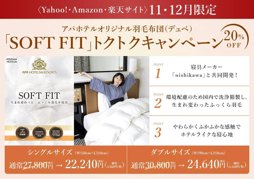 全国ネットワークを展開するアパホテルは、寝具のトップブランド「nishikawa」と協力して、オリジナル羽毛布団「SOFT FIT」を開発しました。これを記念して、2025年11月1日から12月31日までの期間、20%割引キャンペーンを実施します。新たに生まれ変わったふわふわの羽毛を使用したこの商品は、安心・安全・安眠を提供するために設計されています。
