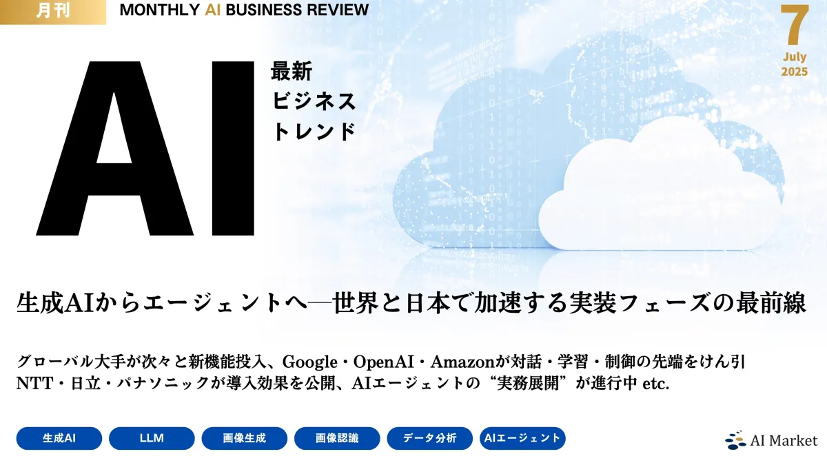 このように、『MONTHLY AI BUSINESS REVIEW 2025年7月号』では、AIに関連するさまざまな最新情報が網羅されています。情報過多の現在、信頼できる情報源からのアップデートが重要です。このレポートは、最新のトレンドを把握するのに最適なツールとなります。また、AI Marketが提供するコンシェルジュサービスを通じて、特定のニーズにあったAI会社の選定支援も受けることができます。