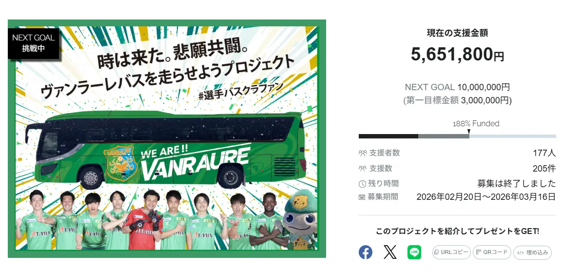 このクラウドファンディングの目的は、ヴァンラーレ八戸のトップチーム用バスを華やかにラッピングし、選手たちを応援することです。実施期間は約3週間と短く、準備やアウェー戦が続く中でのクラウドファンディングは、非常に実現が難しいという挑戦を伴いましたが、177名からの支援が集まり、目標を達成しました。