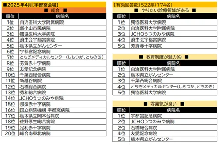 横浜においては、県立こども医療センターが「やりたい診療領域」部門で首位を獲得し、新百合ヶ丘総合病院が全体のトップとなりました。