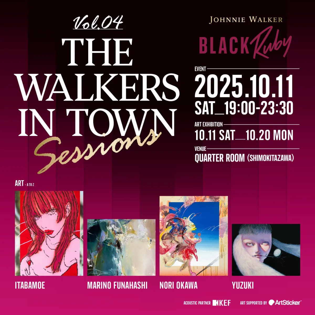 開催日は2025年10月11日(日)、そして会期は10月20日(月)まで。音楽とウイスキーカクテルを楽しむこのイベントでは、参加アーティストによるアートエキシビションも見逃せません。出展作家は、itabamoe、大河紀、Marino Funabashi、弓月の4組。アート作品はArtStickerを通じて購入可能であり、特典が設けられています。