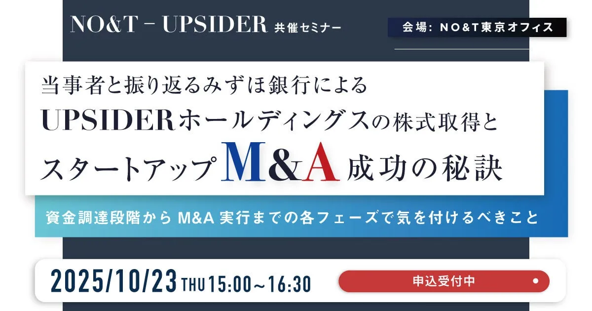 株式会社UPSIDERホールディングスは、2025年10月23日(木)15:00から、長島・大野・常松法律事務所と共にスタートアップM&Aに関する特別なセミナーを開催します。このセミナーは、みずほ銀行によるUPSIDERの株式取得を受けての経験を活かし、実際のプロセスやその中での学びを参加者と共有します。