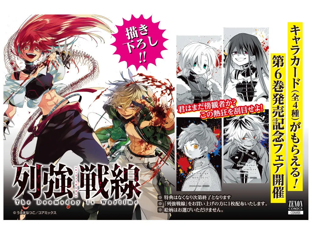 期間中に『列強戦線』を1冊購入するごとに、1枚の描き下ろしキャラカードがプレゼントされます。カードは全4種あり、ファンにはたまらない特典です!ただし、キャラカードは数量限定で先着順に配布されるため、早めにお求めいただくことをお勧めします。