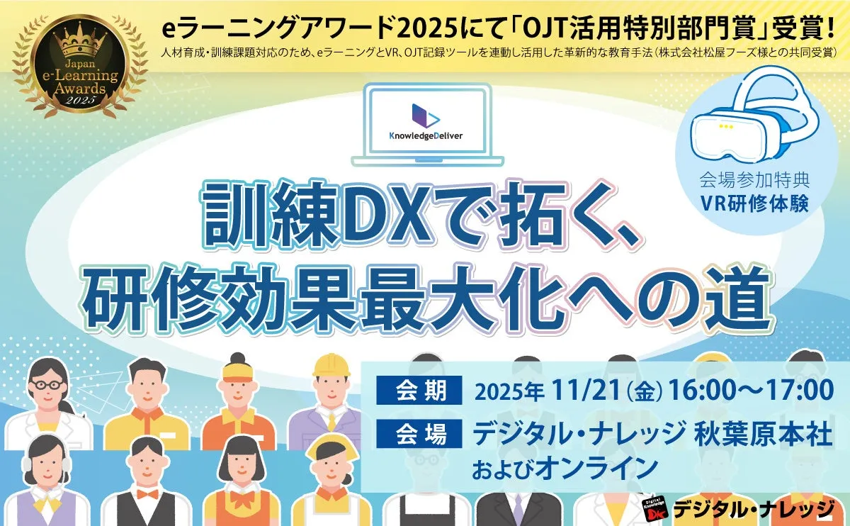 今年、eラーニングアワード2025で「OJT活用特別部門賞」を受賞したことを受けて、株式会社デジタル・ナレッジが特別なセミナーを開催します。テーマは「訓練DXで拓く、研修効果最大化への道」。このセミナーでは、OJT(オン・ザ・ジョブ・トレーニング)を革新するデジタル技術の活用法を詳しく紹介します。
