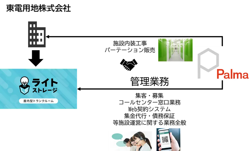 株式会社パルマは、東電用地の新たなセルフストレージ事業の運営効率の向上を目指し、様々なBPO(ビジネス・プロセス・アウトソーシング)業務を支援します。これにより、スムーズな手続きと利用者の利便性を向上させ、さらなる事業の発展を図っていく所存です。