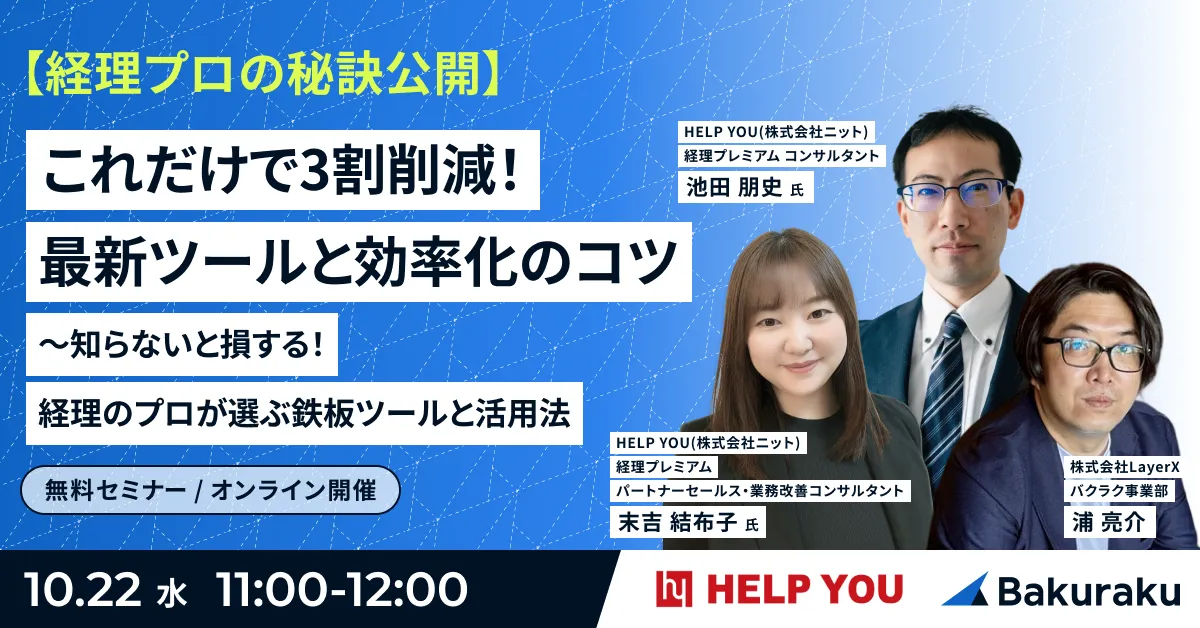 セミナーのテーマは「経理プロの秘訣公開」です。最新ツール「バクラク」を使用して、経理業務を約30%削減するノウハウを紹介します。具体的には、導入による改善事例や成功のステップなど、実務に役立つ情報が満載です。