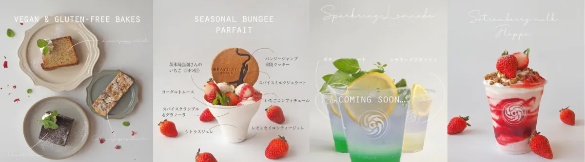 また、イベント会場である「GRAVITATE OSAKA」にもぜひ立ち寄りたいポイントがあります。地元茨木の農家から仕入れた甘い苺を使用した「苺ミルクフラッペ」や「いちごとスパイスのジンジャーパフェ」などのシーズナルメニューが提供されており、心も体も満たされること間違いなしです。