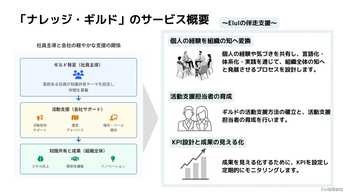 「ナレッジ・ギルド」は、社員主導の新しい学びのエコシステムとして位置づけられ、従業員が自ら学びの主催者となることで、相互に教え合う「ギルド」を形成します。これにより、知識の共有が促進され、組織全体が成長する文化を築くことが目指されています。