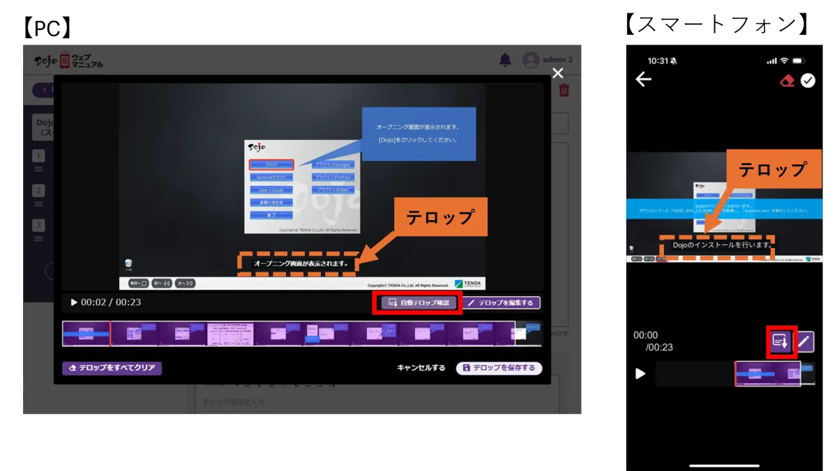 今回のアップデートでは、音声付き動画マニュアルの作成時に便利な「自動テロップ生成機能」が加わりました。前のバージョンでは、動画にテロップを入れる際、手動で文字を入力する必要があったのですが、新機能の追加により、音声を自動で認識し、簡単にテロップが生成できるようになりました。これにより、手間を大幅に削減でき、現場作業のマニュアル作成がグンと楽になります。