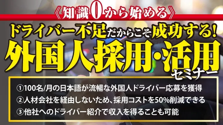 運送業界の人手不足が深刻化する中、外国人ドライバーの採用が注目を集めています。その新たな採用戦略を学べるセミナーが、株式会社船井総合研究所の主催による《知識0から始める》運送業×外国人ビジネス新規参入セミナーとして開催されます。ここでは、このセミナーの魅力をお伝えします。
