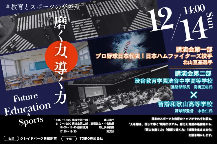 第二部では、智辯和歌山高等学校野球部の中谷仁監督、渋谷教育学園の進路部部長高橋正忠先生、そしてTOiROの代表鶴巻翔平がパネルディスカッションを行います。叱れない、任せきれない現代において、教育現場でどう生徒たちを育てるか、教育×スポーツ×企業の視点を融合させて深堀りします。