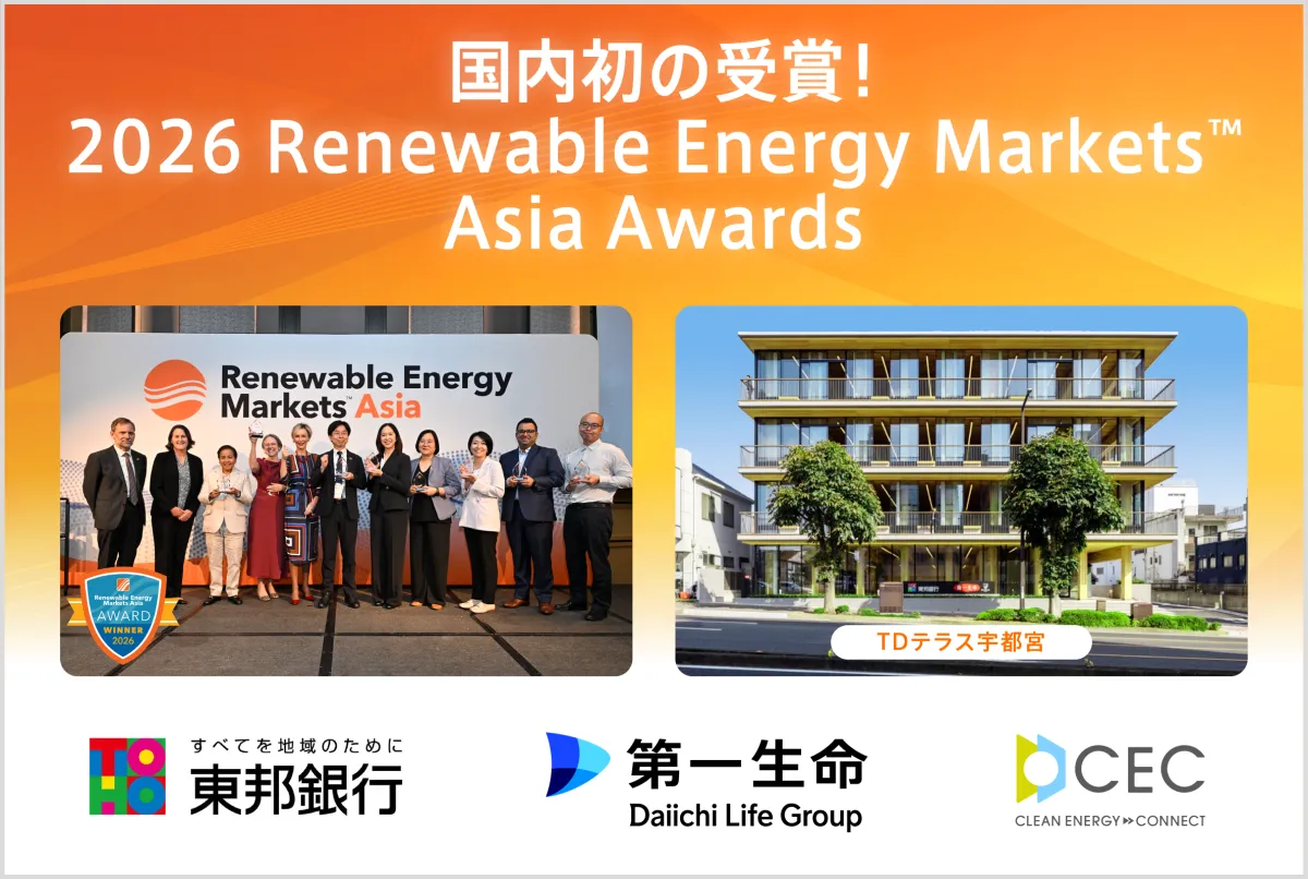 最近、株式会社クリーンエナジーコネクト、第一生命保険株式会社、株式会社東邦銀行の三者が共同で進めるプロジェクト「TDテラス宇都宮」が、名誉ある「2026 Renewable Energy Markets™ Asia Awards」を受賞しました。本賞はアジア地域における再生可能エネルギーの普及と、その市場の発展に貢献した企業や個人を対象とした国際的な表彰です。