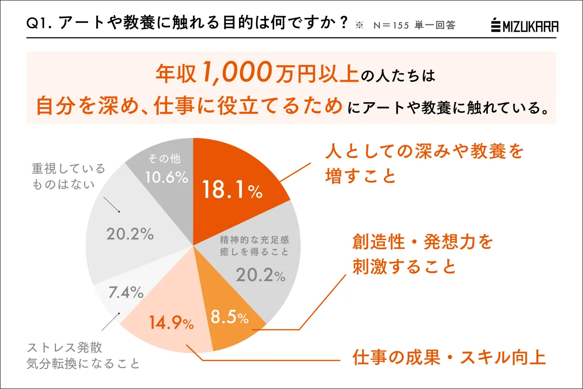近年、アートや教養に対するアプローチが年収によって異なることが明らかになっています。特に年収が1000万円を超える人々は、アートや教養に対して非常に明確な目的意識を持っている傾向が強いのです。株式会社ミズカラが実施した調査によれば、年収1000万円以上の人々は、アートや教養を通じて人間的な深みや教養を増すことを重視し、その結果を仕事や人生に活かそうとしています。実際、彼らの多くはアートや文学に触れ、そこから得た知識を実生活に応用しているため、幸福度も高いとされています。一方で、年収350万円から500万円の層では、アートや教養をストレス発散や気分転換の手段として考えている割合が多く、同じアートに触れてもその目的が異なることが調査から伺えます。