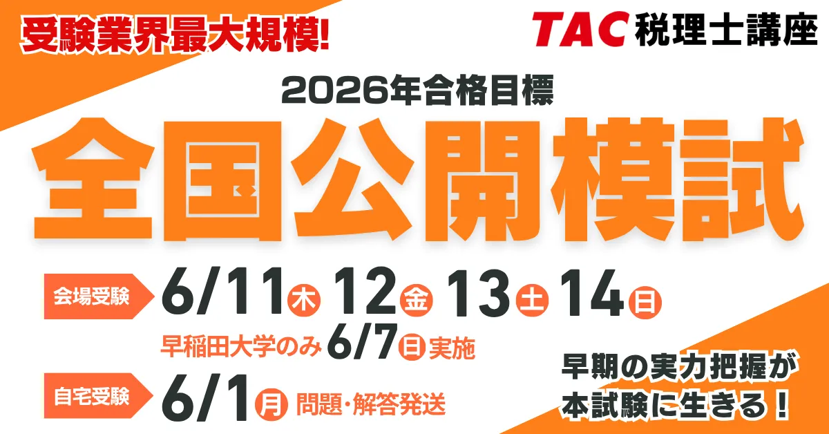 2026年合格を目指す受験生に朗報です。TAC税理士講座が主催する「全国公開模試」が開催されることが決まりました。この模試は多くの受験生が集結し、実際の試験さながらの環境を体験できる貴重な機会です。受験を通じて、自らの実力を試す良いチャンスですので、ぜひ参加をご検討ください。