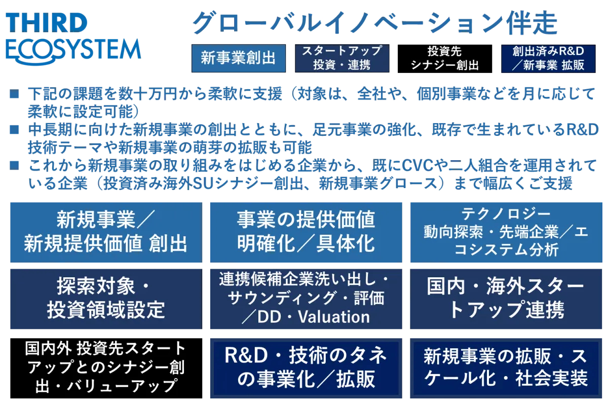 - - 概要: 国内外のスタートアップの連携を促進し、新たな事業機会の創出を目指しています。