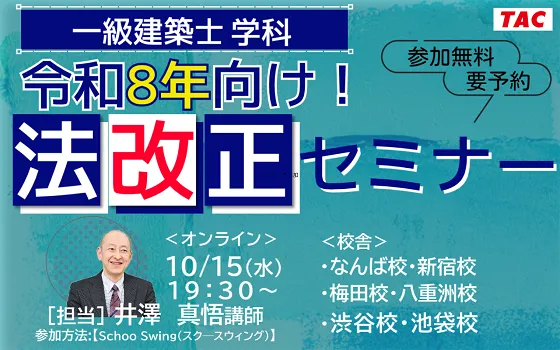 資格取得を目指す皆様、お待たせしました!TAC株式会社が令和8年度一級建築士学科試験に向けた法改正セミナーを開催します。