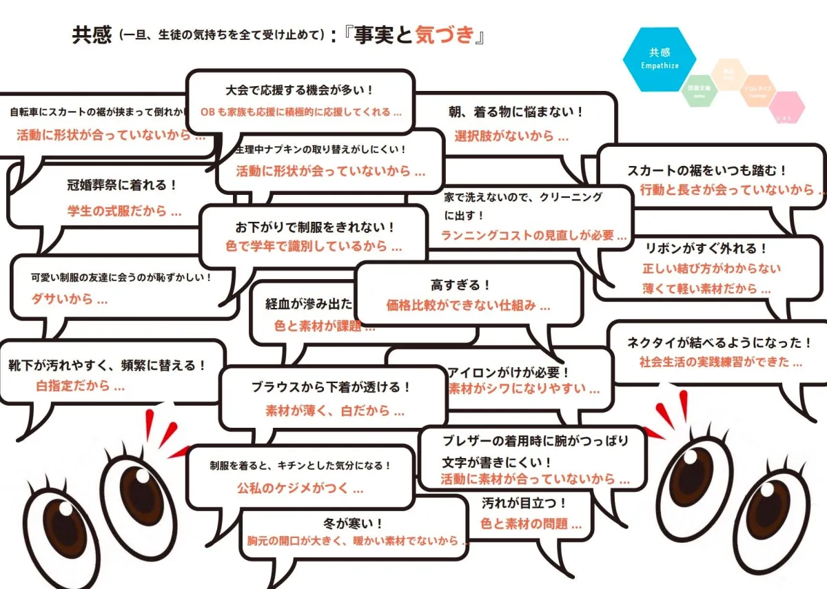 2021年より富商はデザイン思考教育に着手。生徒が自ら問いを立て、考え、形にするプロセスは、受け身の学びから能動的な学びへと変化をもたらしました。特に注目されるのは、制服をテーマにしたプロジェクトです。「自分が着たい制服とは何か?」という疑問からスタートした授業は、生徒たちの熱意を引き出す要因となっています。生徒はインタビューを通じて情報を集め、アイデアを試作し、フィードバックを得て改良を重ねるというサイクルを経験しました。この実践を通じ、彼らはデザイン思考の基本的プロセスを自然と学んでいくのです。