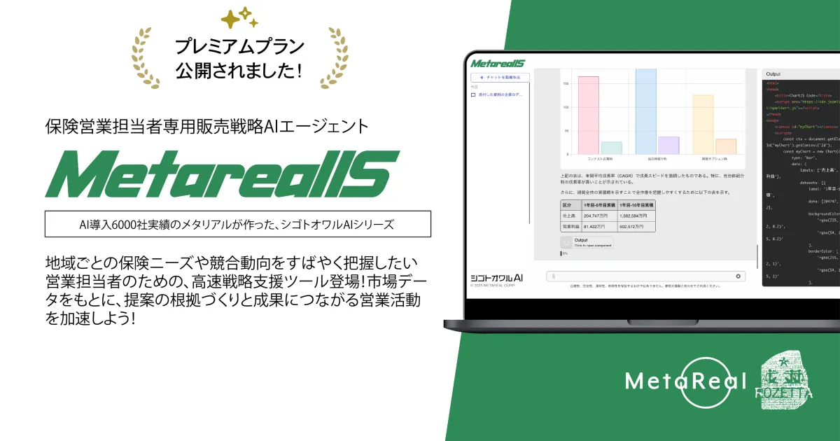 2025年8月19日、株式会社ロゼッタが提供する保険販売戦略と市場分析を支援するAIエージェント『Metareal インシュランスセールス(Metareal IS)』のプレミアムプランが始まります。このプランでは、月額5万円(税込)で、1日20回、月200回の利用が可能です。保険営業の現場では、どの保険を・誰に・いつ提案するかの判断がしばしば経験に頼りがちですが、Metareal ISがその判断をデータの力でサポートします。