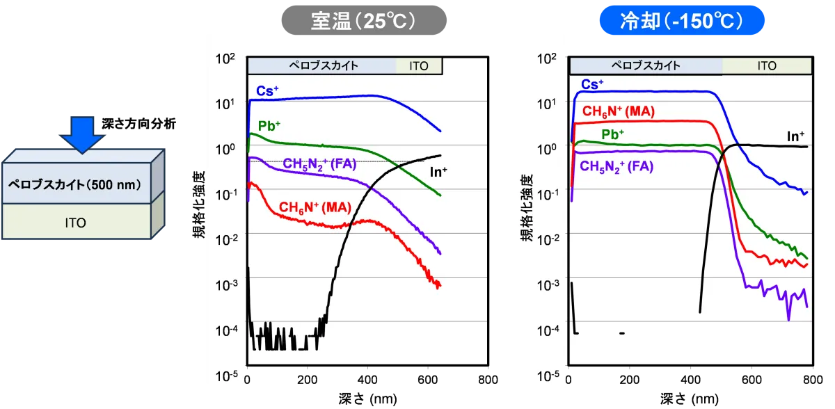 この新技術は、ガスクラスターイオンビーム照射型の飛行時間型二次イオン質量分析法(GCIB-TOF-SIMS)を用いて、試料を冷却状態で測定することにより、有機成分の揮発や材料の変性を防ぎます。これにより、ペロブスカイト太陽電池の層構造を忠実に反映した解析が可能となり、正確なデータを得ることができるのです。