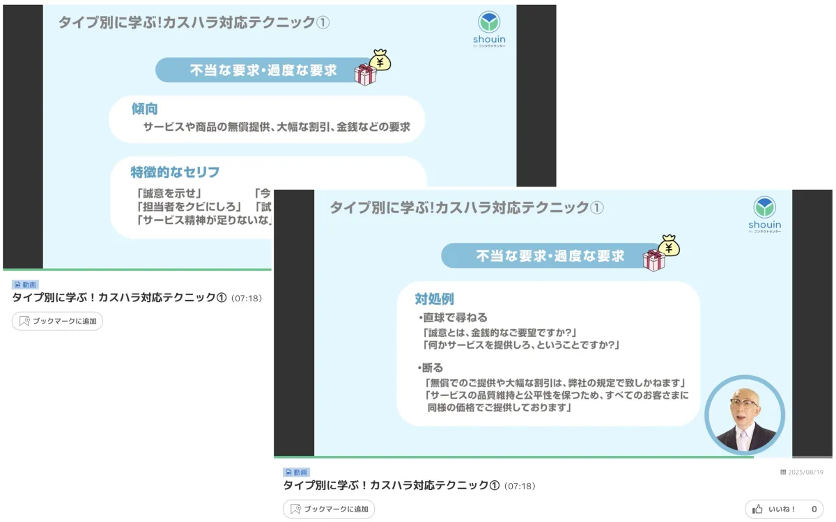 新しい研修動画では、カスハラの種類が多様であることを踏まえ、「暴言・脅迫」や「不当・過度な要求」といったタイプ別に効果的な対処法が解説されています。また、カスハラによって引き起こされる心身の負担を軽減するためのセルフケア方法も提供されており、実践的な内容が盛り込まれています。