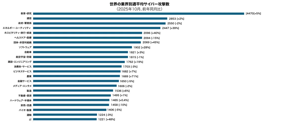 最も攻撃を受けているのは教育・研究分野で、週平均4,470件のサイバー攻撃に直面しています。次いで、通信業界が平均2,583件、政府・軍関係が2,550件の攻撃を受けています。このように、特に重要なデータを扱う組織がターゲットにされる傾向が続いています。
