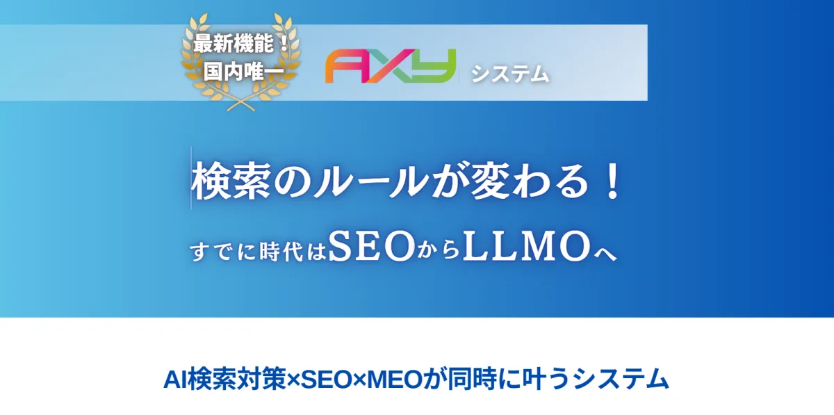 AXiYシステムは、AI検索(LLMO)、MEO、SEOを同時に最適化する国内唯一のシステムで、具体的には次のような機能を備えています。
