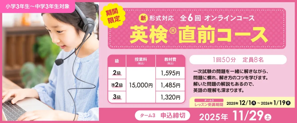 英会話教室を運営する株式会社イーオンでは、2026年1月25日(日)に予定されている英検(R)に向け、オンライン校にて特別コース「英検(R)対策直前コース」を開講します。このコースでは、キッズクラスや高校生以上のクラスを対象に、実際の試験問題を解きながら、試験の形式や解答テクニックを学ぶことができます。解答した問題に対する詳しい解説も行うため、英語理解が深まり、試験への自信を養うことができます。
