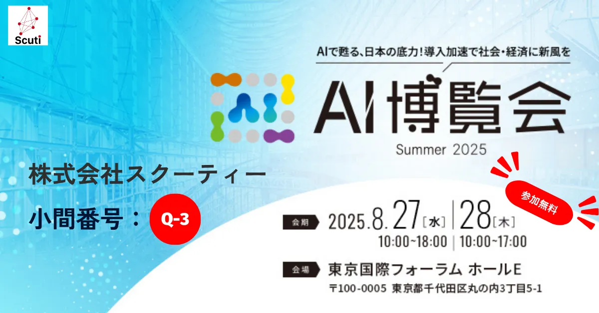 2025年8月27日(水)から28日(木)にかけて、東京国際フォーラムで開催される「AI博覧会 Summer 2025 東京」に、生成AI技術に特化したオフショア開発会社「スクーティー」が出展します。当社は、ホールEの小間番号Q-3で最新の生成AI技術のデモを実演します。ここでは、生成AI-OCR技術による商品カタログの自動情報抽出や、RAG(Retrieval-Augmented Generation)技術の実演を通じて、業務の効率化やAI導入のアイデアをご紹介します。