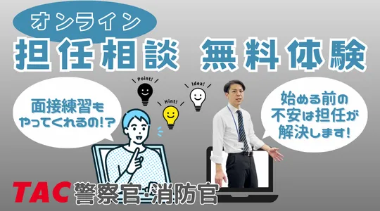 2026年4月からの試験に向けて、警察官または消防官を目指す方に朗報です。TACでは、受講生の不安を解消するための「オンライン担任無料相談」を実施します。この機会にぜひ、担任講師と直接話してみませんか?