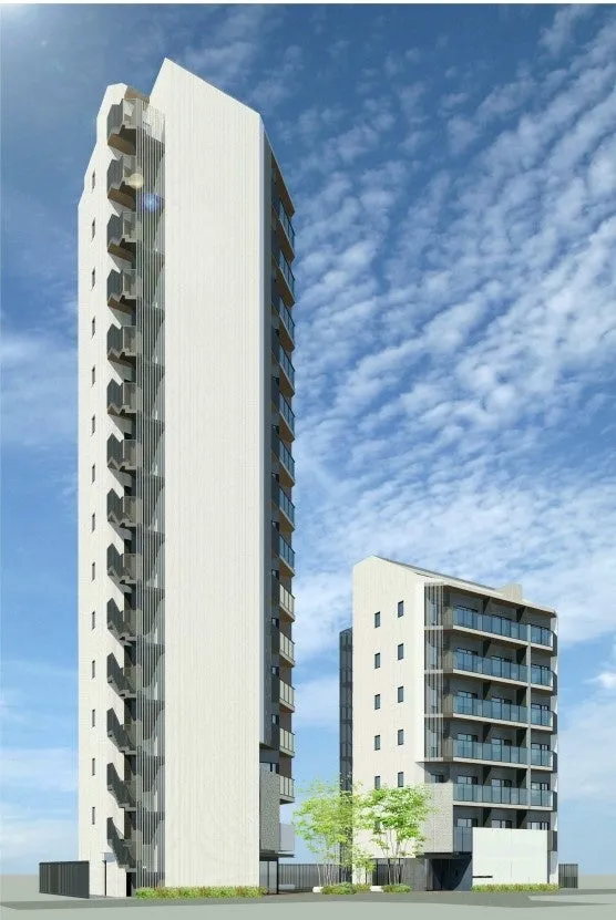 この賃貸レジデンスは、鉄筋コンクリート造で、東棟は地上15階、西棟は地上8階建てとなっています。総戸数は39戸(東棟)と19戸(西棟)で、居住空間の専有面積はそれぞれ27.00㎡から49.21㎡までが提供されています。現在は2025年12月に着工し、2027年11月の竣工を予定しています。