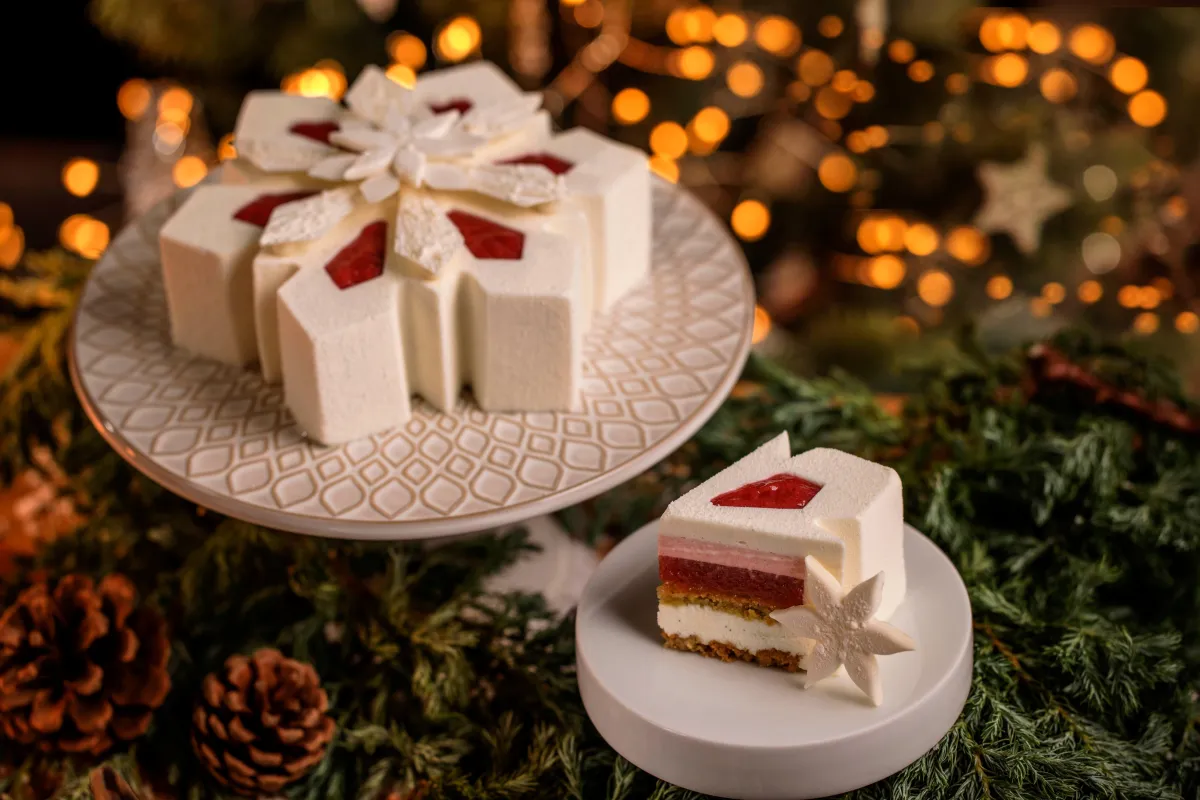 小さくカットしてもその美しい外観を保ち、クリスマスカラーの層が目を楽しませてくれます。装飾された雪の結晶のチョコレートが、クリスマスの特別なひとときをさらに華やかにします。
