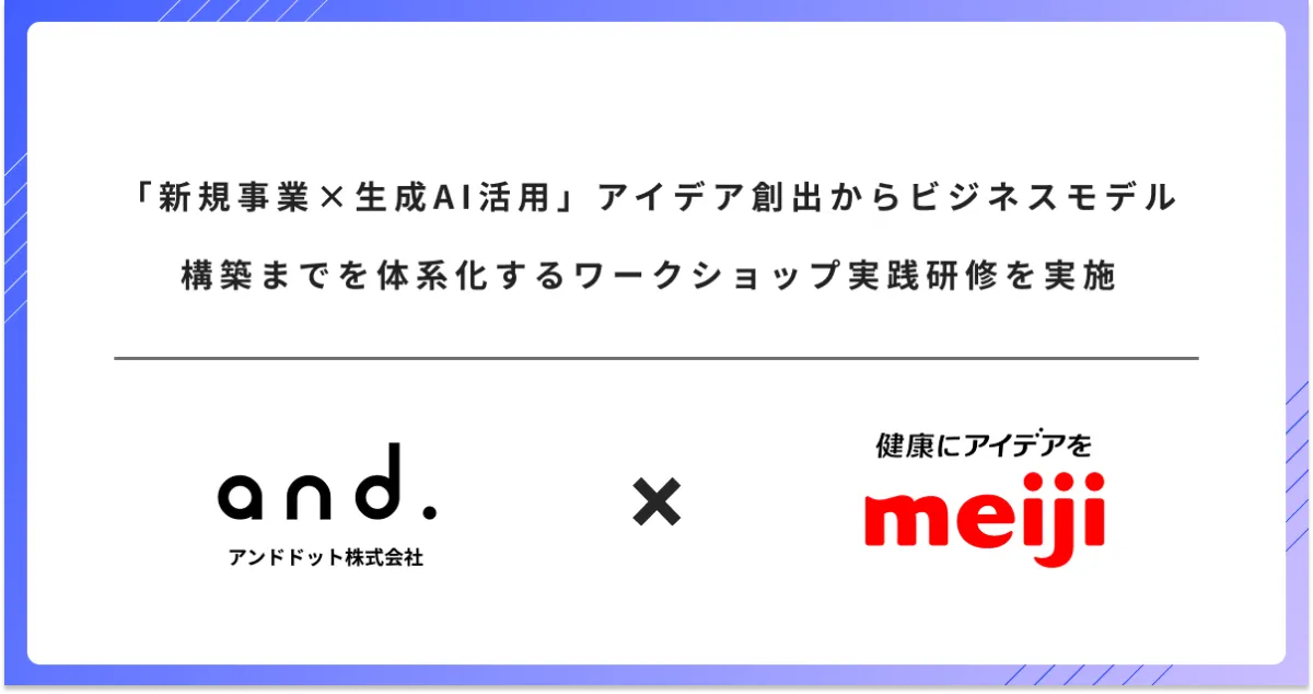 近年、ビジネス界で注目を集めている生成AI。多くの企業がその導入に取り組み、新たな価値を生み出そうとしています。そんな中、アンドドット株式会社は、株式会社明治のイノベーション事業戦略部向けに、「新規事業×生成AI活用」に特化したワークショップを実施しました。この研修では、生成AIを通じた新規事業の開発方法を体系的に学ぶことができます。実際に業務に活用できる内容が、参加者から高く評価されています。