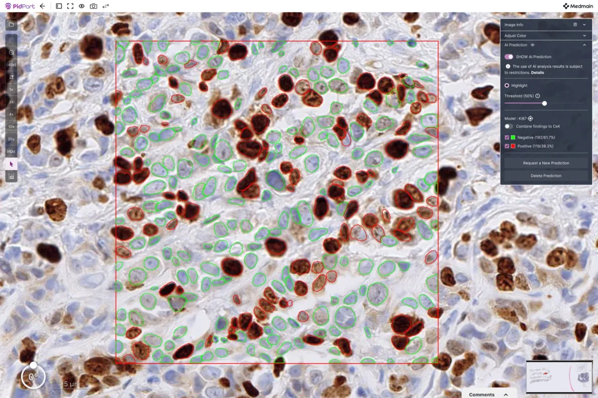 メドメインのAIモデルは、320枚のKi-67染色標本をデジタル化し、細胞の個別アノテーションを行うことで学習を進めました。このモデルは、細胞核を検出し、陽性細胞と陰性細胞を自動的に識別し、そのデータに基づいて陽性細胞率を算出することが可能です。