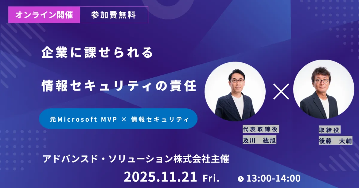 情報社会が進展する中、企業にとって情報セキュリティは避けて通れないテーマとなっています。そんな中、アドバンスド・ソリューション株式会社が主催する「セキュリティ対策講座第2回」が、11月21日(金)に開催されます。この特別無料セミナーでは、Microsoft MVPを15回受賞したプロエンジニアが、セキュリティの基本から実践的なノウハウまでを幅広く解説します。