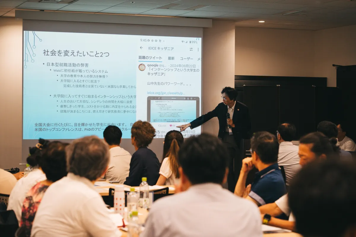 基調講演を行った山中直明氏(慶應義塾大学教授)は、日本の就職活動が抱える問題について厳しく指摘。「卒業論文や修士論文は、単なる成果物ではなく、思考力を養うための貴重な教育の機会です」と述べ、日本特有の初任給制度には柔軟な見直しが必要であると提言しました。また、留学生の就職率の低下に触れ、日本の人材活用の不十分さを考える新たな視点を提供しました。