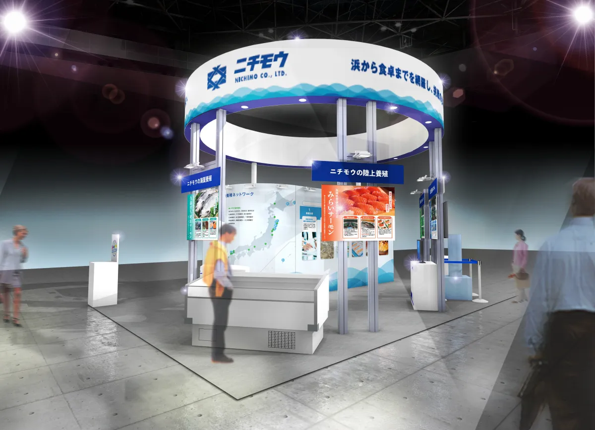 ニチモウは、「浜から食卓までを網羅し、挑戦の歩みを未来へ」という新たなビジョンのもと、養殖事業に関する様々な取り組みを展示します。ブースでは、陸上養殖や海面養殖に関する最新技術や製品が紹介され、その革新性に注目が集まります。