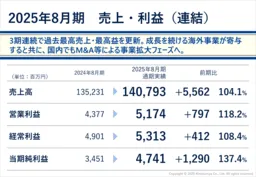 2025年8月期の売上高は1,407億9,329万円で、前年対比104.1%の成長を示しています。営業利益も51億7,496万円に達し、これは前年より118.2%の増加です。経常利益や純利益もそれぞれ増加し、特に親会社株主に帰属する当期純利益は47億4,194万円と、137.4%のアップを記録しています。これらの結果は、主力の書店事業が順調に成長していることを示しています。