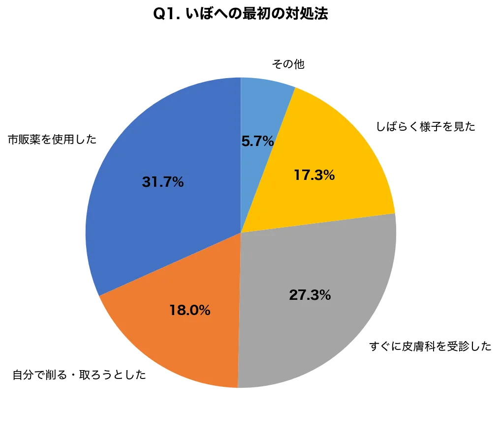 いぼができた場合、まずは皮膚科を受診することが推奨されます。調査では、いぼができた際にすぐに皮膚科を受診した人は27.3%にとどまり、半数以上は自己判断での対処を行っています。この認識を改善することで、適切な治療に繋がり、患者の負担を軽減することが期待されます。