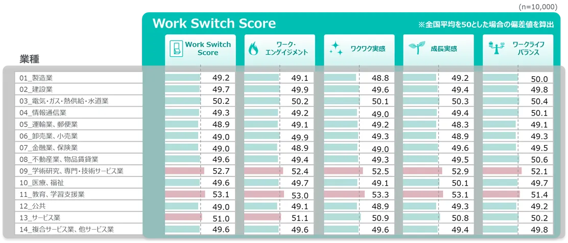 この調査によれば、最も高いスコア(52.7ポイント)を記録したのは「学術研究、専門・技術サービス業」で、全体の平均スコア(50.0)を大きく上回りました。また、「教育、学習支援業」は「ワーク・エンゲイジメント」で53.0ポイントとし、最高得点をマークしました。