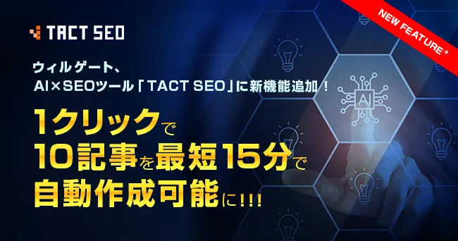 株式会社ウィルゲートは、AIとSEOを組み合わせた革新的なツール「TACT SEO」に新機能を追加しました。この新機能は、SEO担当者にとって大きな助けとなるでしょう。これにより、これまで大変だった記事作成のプロセスが、わずかワンクリックで最大10記事を15分で自動生成できるようになります。