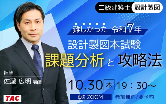 TAC株式会社が主催する『二級建築士(設計製図)難しかった令和7年設計製図本試験課題分析と攻略法』セミナーが、2025年10月30日(木)にオンラインで開催されます。このセミナーは、二級建築士の設計製図試験を受けた方や今後受験を予定している方にとって、貴重な情報を得る絶好の機会です。