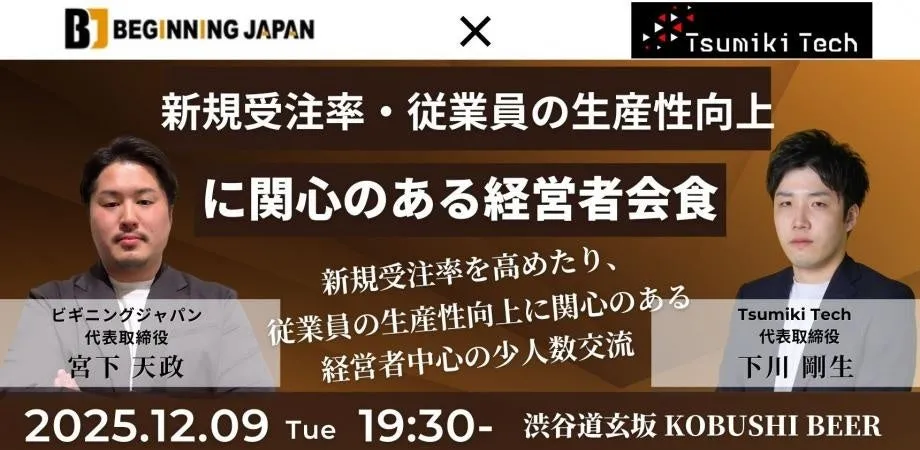この特別な交流会は、ビギニングジャパンの宮下代表とTsumiki Techの下川代表の共催によって実現します。新規受注を増やす方法や、社員が生き生きと働ける環境づくりに必要なノウハウについて、参加者同士で率直に語り合います。リラックスした雰囲気の中で、本音のエピソードを交えながら具体的な実践アイデアを引き出すことができるのがこのイベントの魅力です。