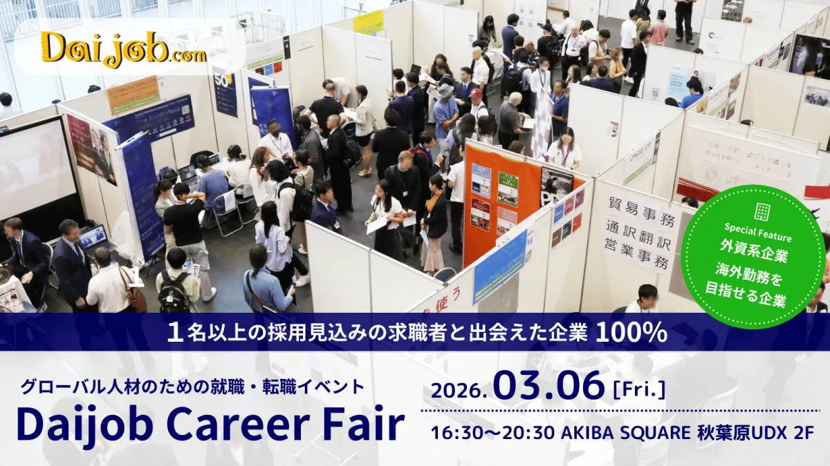 2026年3月6日、秋葉原のAKIBA SQUAREにて「第59回Daijob Career Fair」が開催されます。このイベントは、英語をはじめとする語学力を活かし、キャリアを築きたいグローバル人材に特化した対面型の転職イベントです。出展企業の募集が始まりました。
