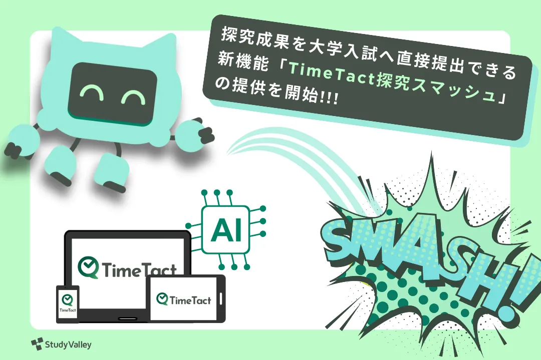 株式会社Study Valleyが提供する探究学習プラットフォーム「TimeTact」では、新たに高校生が探究学習の成果を大学入試へ直接提出できる新機能「TimeTact探究スマッシュ」の提供をスタートしました。この機能により、学生たちは自身の長年の努力や成長を、より実践的にアピールすることができる環境が整います。