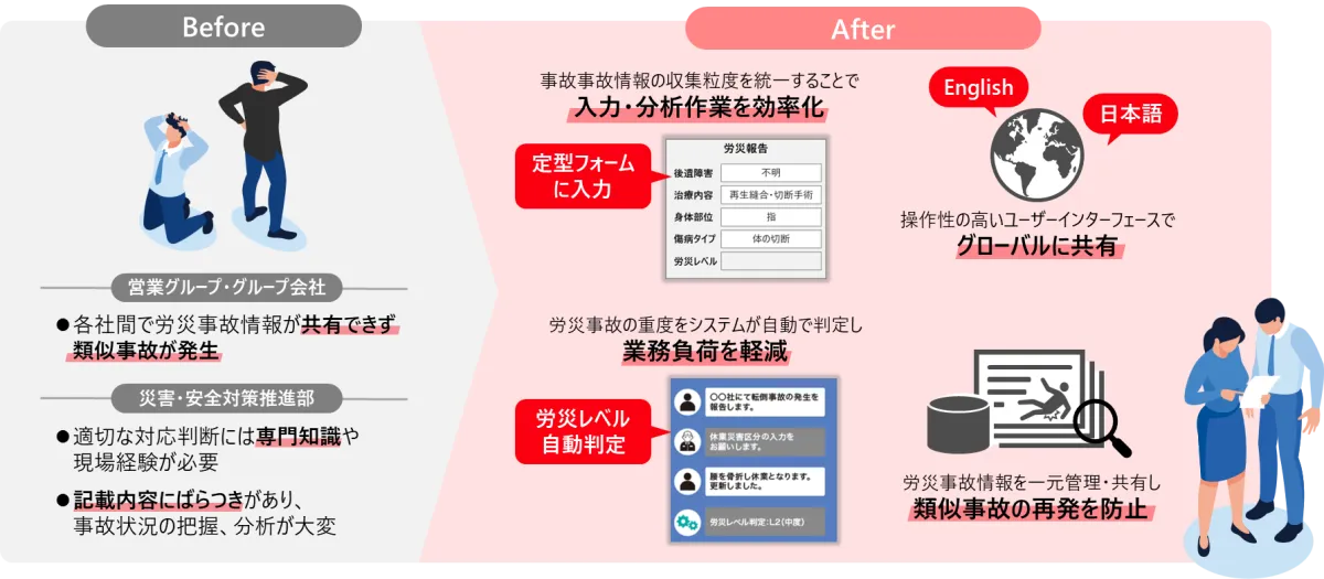近年、多様なビジネスモデルを展開する住友商事では、労働災害の発生が増加しています。国や地域ごとに異なる事業環境が、労災事故情報のばらつきを生み出していました。このため、事故状況の正確な把握や再発防止策の検討には時間と労力がかかるという課題がありました。また、専門知識や現場経験が求められる労働安全業務に従事できる人材が限られていました。